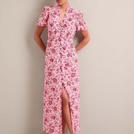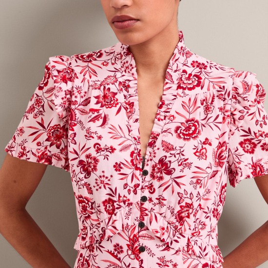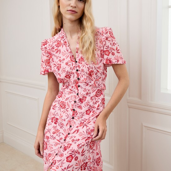The Liliana dress flatters so many figures thanks to its V-neckline;high hip-skimming waist and softly shoulder-defining frill detailing. Designed in a beautifully drapey cotton viscose georgette that’s fully lined;it’s practical as well as pretty - the rouleau buttons are stitched down through the bust and waist to avoid gaping but can be opened at the bottom to show off more leg.