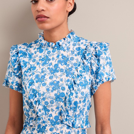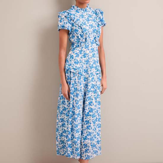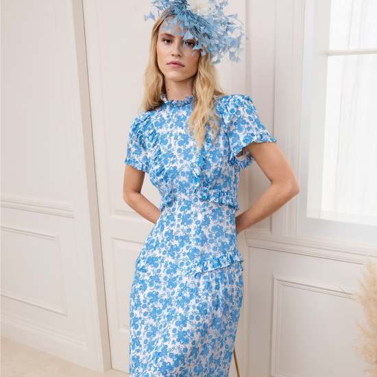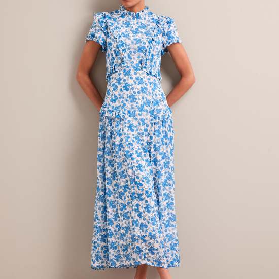 Our sell-out Mirabel dress is back to deliver stand-out status at summer events. Designed in delicate georgette with glittering gold fil coupé detailing to give light-reflecting sparkle;the contouring cut and frill placement makes it incredibly flattering. Fully lined yet light and airy;we have perfected the fit of this season’s iteration with a slightly shorter length to enhance its wearability.