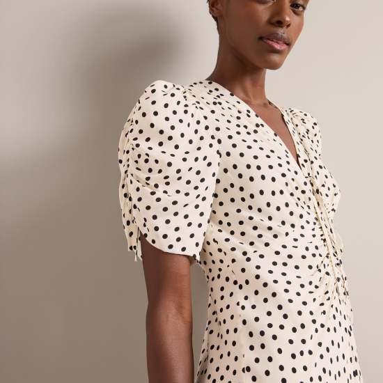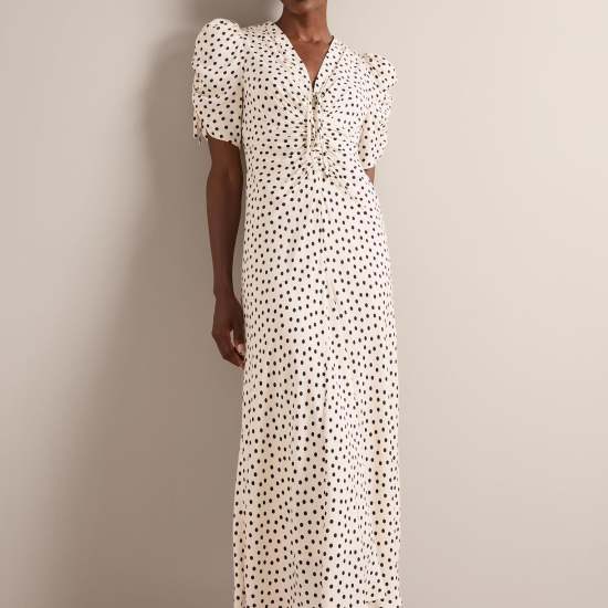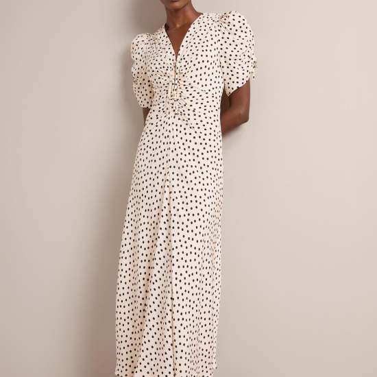 On-trend and ready to party;Ophelia has a dramatic silhouette and vintage feel with its oversized statement sleeve and voluminous bias-cut skirt with godet inserts. Fully lined;the ruche detailing and shirring at the back waist make it fitted yet forgiving. Accessorize with a killer heel and cocktail in hand and get ready to receive your compliments.