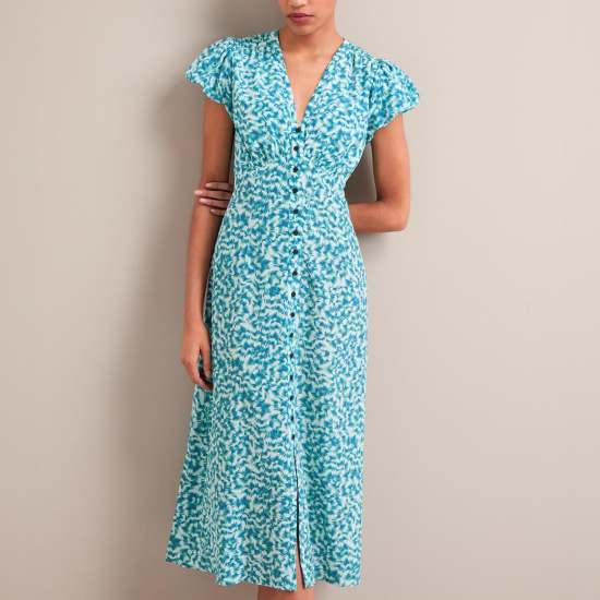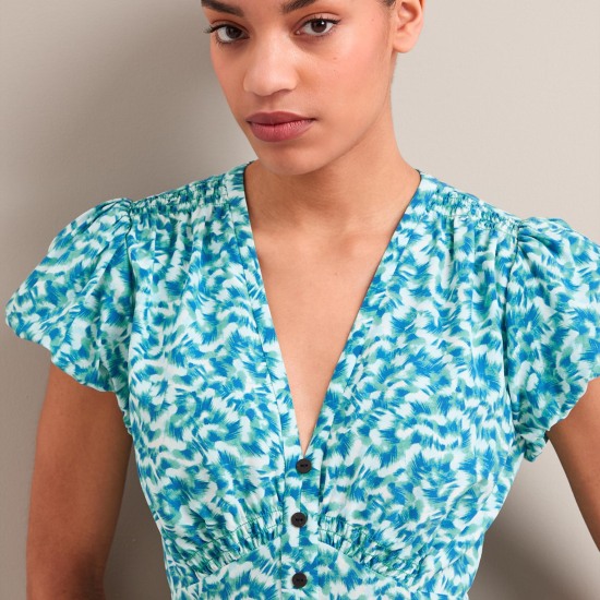 Cool;modern and elegant;Leila’s puff sleeve;V-neck and under-bust shirring create a super flattering silhouette. Cut from lightweight and luxe crepe de chine;it has fixed buttons (so won’t gape) and sexy side slits to allow easy movement. Choose between our iconic Camo Pansy print in a soft yet stand-out red;or new-for-this-season Abstract Feather print.