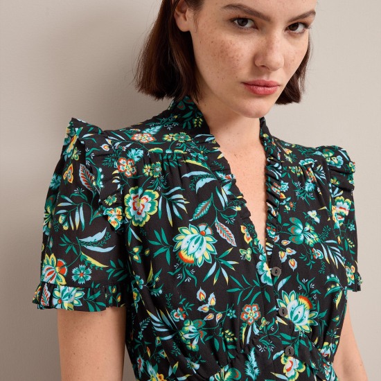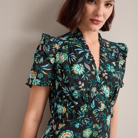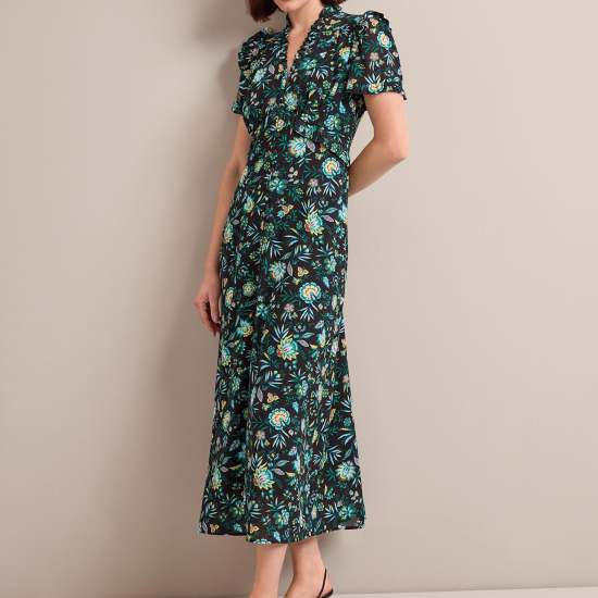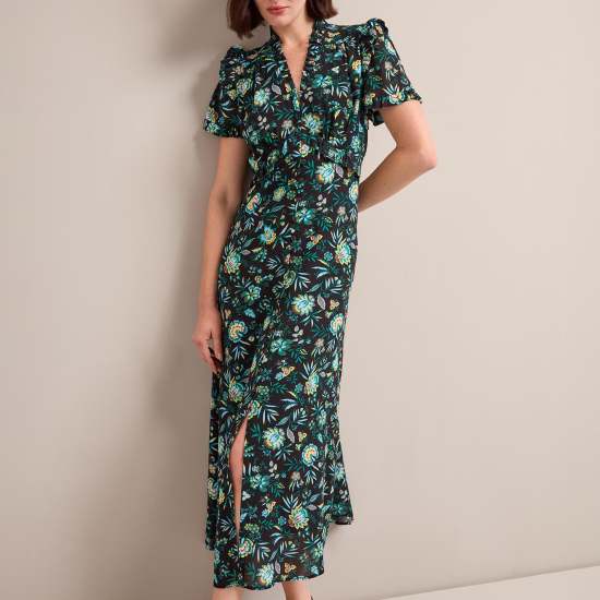 The Liliana dress flatters so many figures thanks to its V-neckline;high hip-skimming waist and softly shoulder-defining frill detailing. Designed in a beautifully drapey cotton viscose georgette that’s fully lined;it’s practical as well as pretty - the rouleau buttons are stitched down through the bust and waist to avoid gaping but can be opened at the bottom to show off more leg.