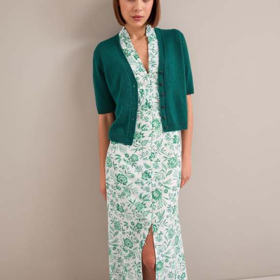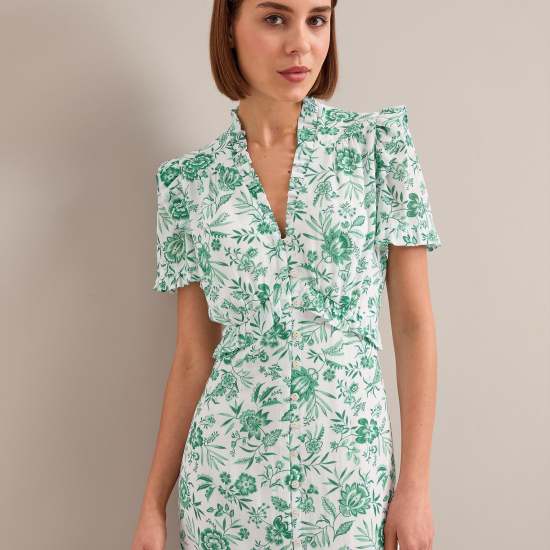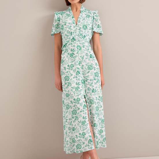 The Liliana dress flatters so many figures thanks to its V-neckline;high hip-skimming waist and softly shoulder-defining frill detailing. Designed in a beautifully drapey cotton viscose georgette that’s fully lined;it’s practical as well as pretty - the rouleau buttons are stitched down through the bust and waist to avoid gaping but can be opened at the bottom to show off more leg.